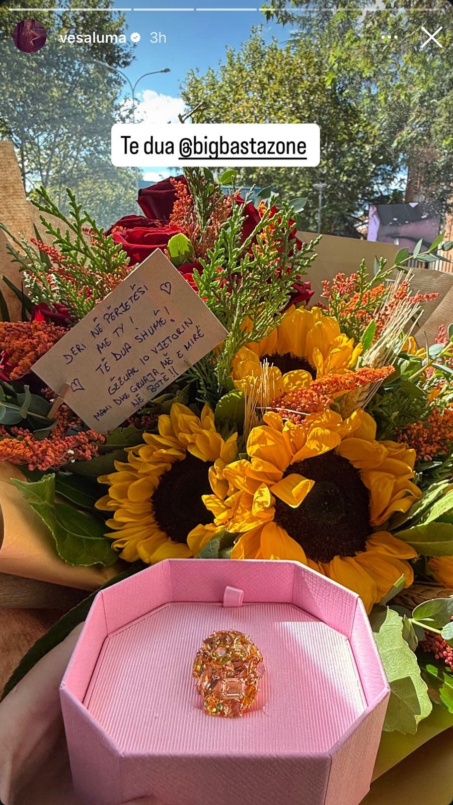 Big Basta ka befasuar Vesa Lumën me një buqetë të madhe me lule të freskëta dhe një dhuratë plot shkëlqim, një unazë mjaft të veçantë.
