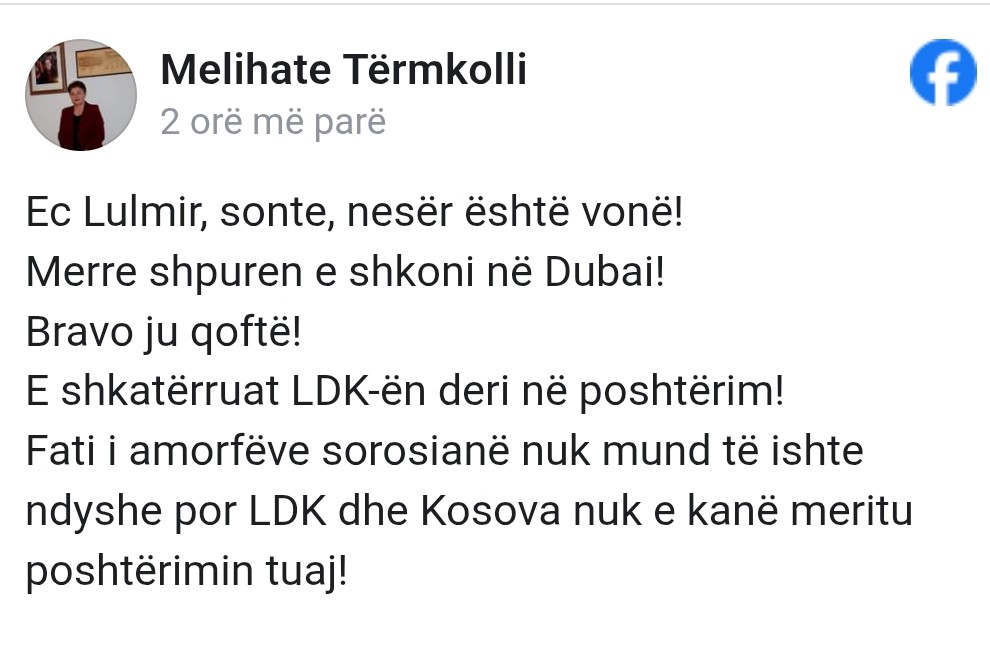 “Ec Lulmir, sonte, nesër është vonë! Merre shpuren e shkoni në Dubai! Bravo ju qoftë! E shkatërruat LDK-ën deri në poshtërim! Fati i amorfëve sorosianë nuk mund të ishte ndyshe por LDK dhe Kosova nuk e kanë meritu poshtërimin tuaj!”, ka shkruar ajo.