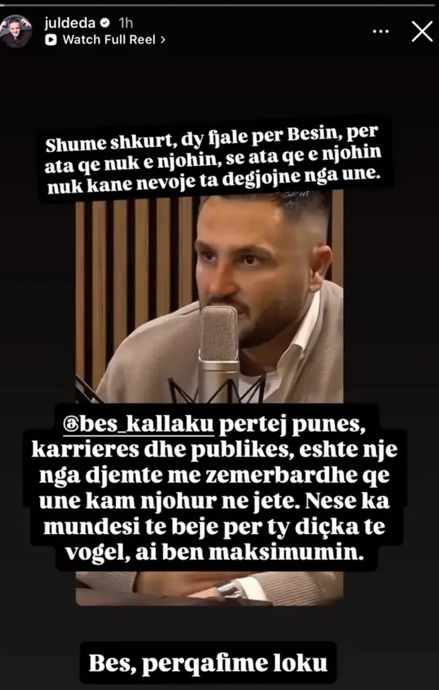 “Përtej punës, karrierës dhe publikut, Bes Kallaku është një nga djemtë me zemrën më të bardhë që kam njohur në jetë. Nëse ka mundësi të bëjë për ty diçka të vogël, ai bën maksimumin,” shkruan Jul Deda, krahas videos së podcastit të Grida Dumës, ku i ftuar ishte Besi.