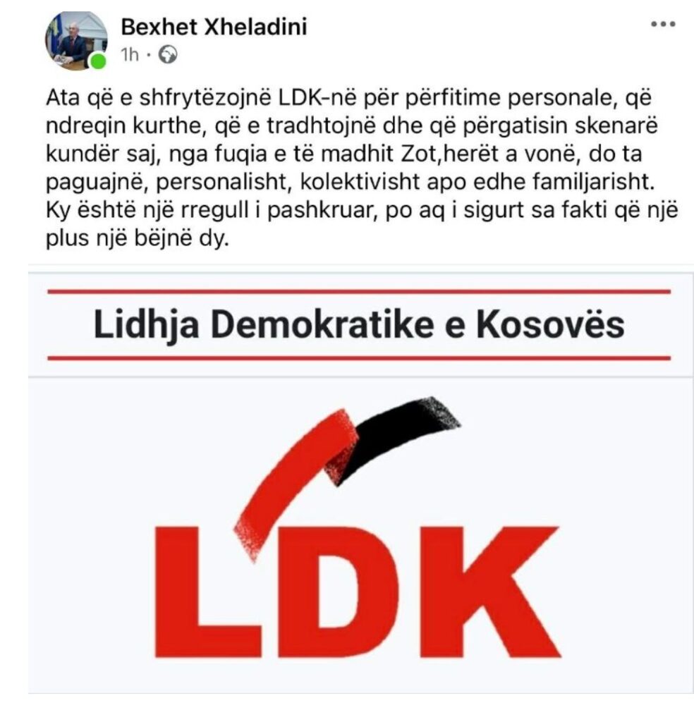 Ata që e shfrytëzojnë LDK-në për përfitime personale, që ndreqin kurthe, që e tradhtojnë dhe që përgatisin skenarë kundër saj, nga fuqia e të madhit Zot,herët a vonë, do ta paguajnë, personalisht, kolektivisht apo edhe familjarisht. Ky është një rregull i pashkruar, po aq i sigurt sa fakti që një plus një bëjnë dy.