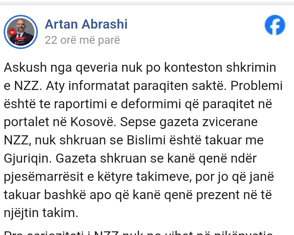 “Askush nga qeveria nuk po konteston shkrimin e NZZ. Aty informatat paraqiten saktë. Problemi është te raportimi e deformimi që paraqitet në portalet në Kosovë. Sepse gazeta zvicerane NZZ, nuk shkruan se Bislimi është takuar me Gjuriqin. Gazeta shkruan se kanë qenë ndër pjesëmarrësit e këtyre takimeve, por jo që janë takuar bashkë apo që kanë qenë prezent në të njëjtin takim.