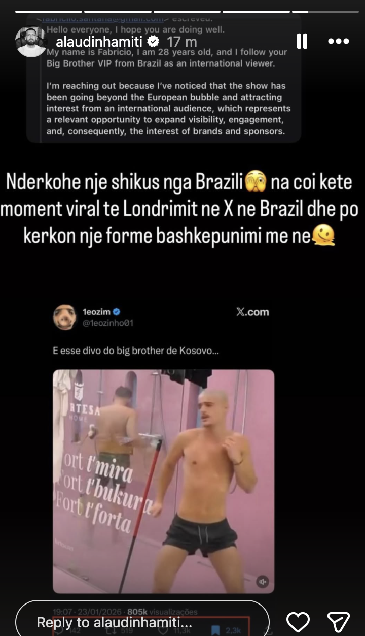 “Ndërkohë një shikues nga Brazili na çoi këtë moment viral të Londrimit në X në Brazil dhe po kërkon një formë bashkëpunimi me ne,” shkroi Alaudini krahas fotos ku Londrimi shfaqet duke kërcyer.