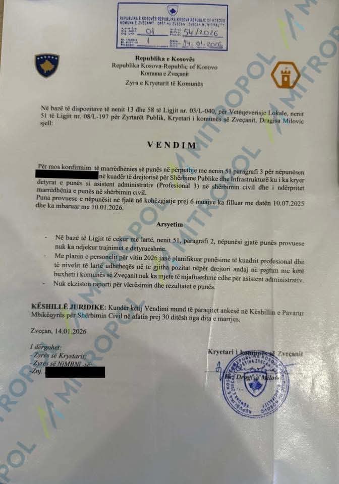 Në arsyetim për ndërprerjen e marrëdhëniea së punës thuhet se kjo po bëhet në bazë të dispozitave të nenit 13 dhe 58 të Ligjit nr. 03/L-040, për Vetëqeverisje Lokale, nenit 51 të Ligjit nr. 08/L-197 për Zyrtarët Publik.