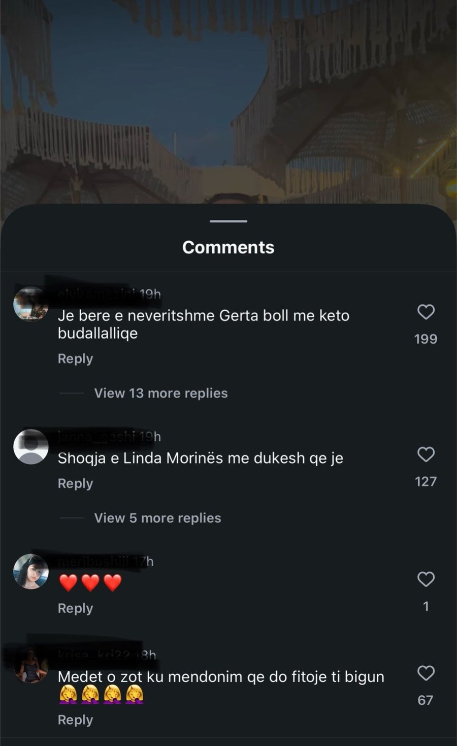 Mirëpo, fansat e Gertës nga “Big Brother”-i ose nuk e pëlqejnë më të preferuarën e tyre, ose s’kanë më interes, sepse poshtë këtij postimi të saj mbizotëruan komentet negative: