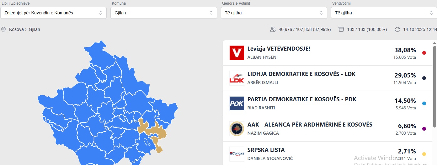 Sipas të dhënave nga KQZ, prin Lëvizja Vetëvendosje me 38,08%(15,605 vota), pas saj vjen Lidhja Demokratike e Kosovës me 29,05(11,904 vota).