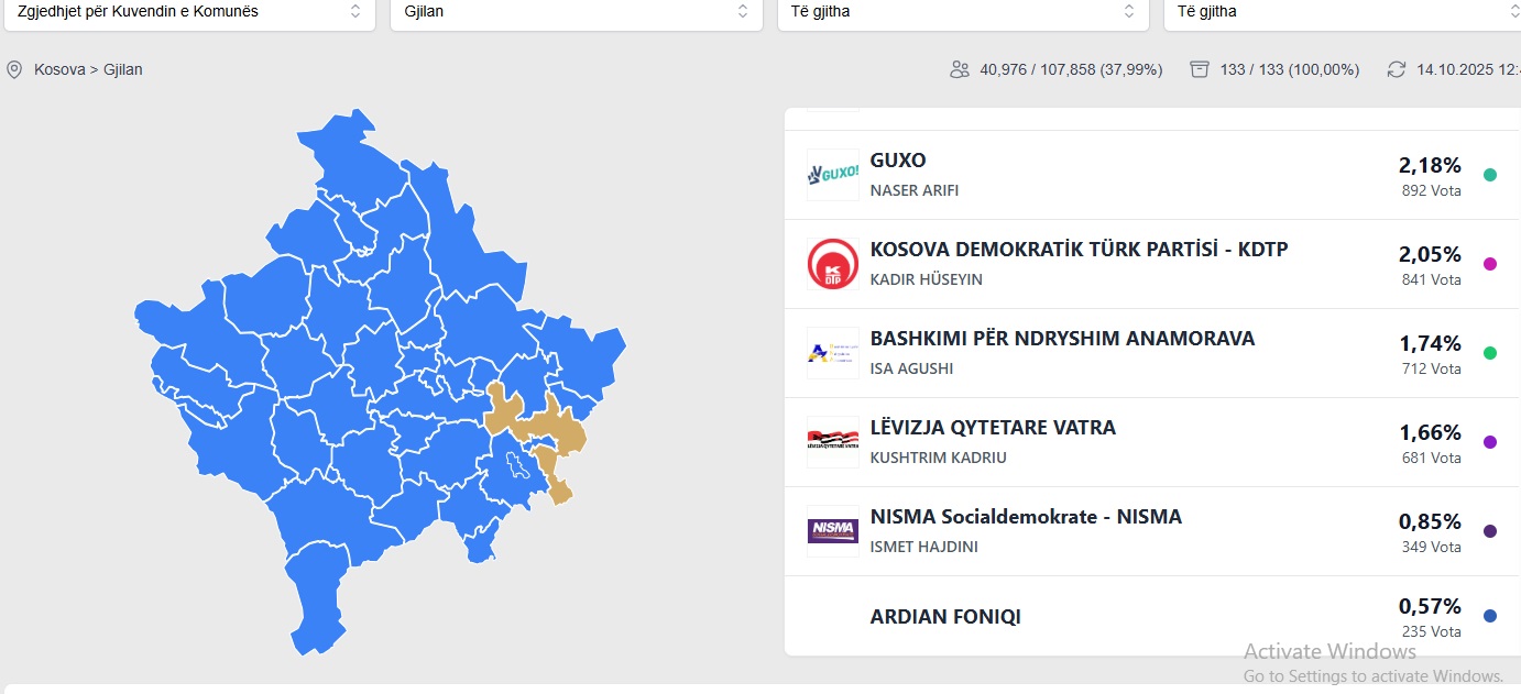 Në vendin e tretë radhitet PDK me 14,50%(5,943 vota), AAK me 6,60%(2,703 vota), Srpska Lista me 2,71%(1,111 vota), Guxo me 2,18%(892 vota).