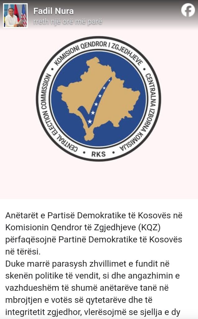 “Sjellje të tilla dëmtojnë imazhin dhe besueshmërinë e Partisë Demokratike të Kosovës në një institucion të rëndësishëm siç është KQZ-ja”, shkruan ndër të tjera Nura.