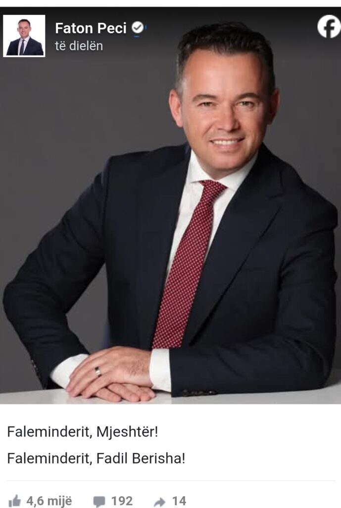 “Faleminderit, Mjeshtër! Faleminderit, Fadil Berisha”, ka shkruar Peci.