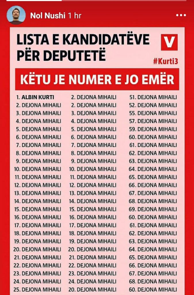 Nol Nushi, anëtar i PSD-së, është tallur me “listë” të VV-së, ku kandidat janë Albin Kurti, numër 1, dhe Dejona Mihali prej numër 2 në 110.