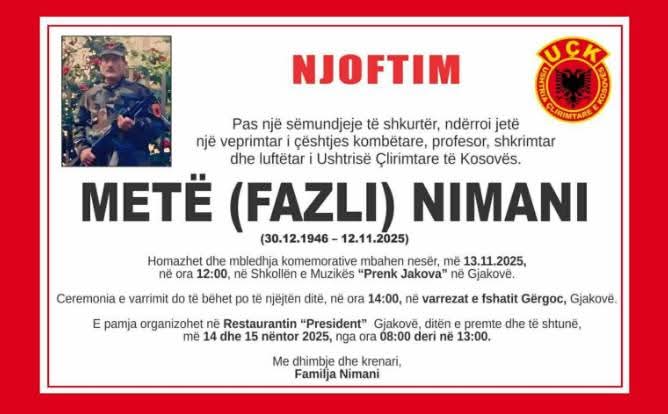 “Sot, më 12.11.2025, në orën 15:00, ndërroi jetë babai ynë, Metë Fazli Nimani.