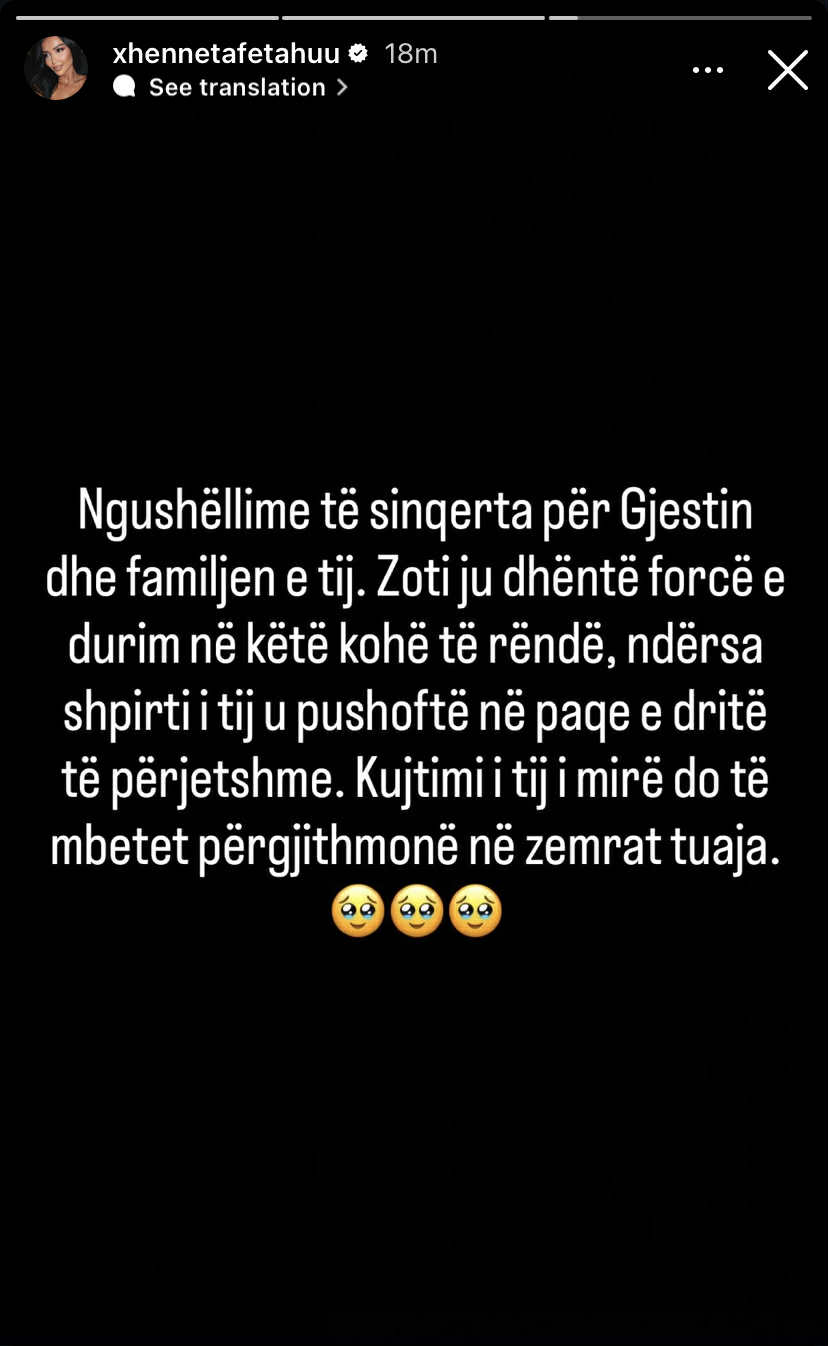 Ish-banorja e ‘Big Brother VIP Kosova’ Xheneta Fetahu, ka shprehur ngushëllimet më të sinqerta për Gjestin dhe familjen e tij, shkruan “Kosovarja”.